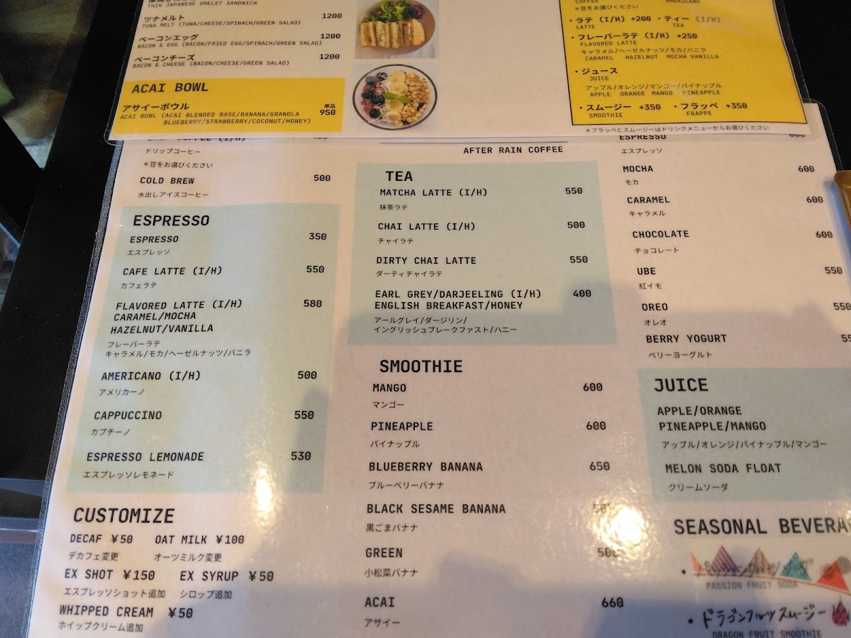 Welcome to After Rain Coffee, a charming café located in the heart of Okinawa, Japan. This delightful spot offers a cozy Scandinavian-style atmosphere, perfect for both casual meetings and quiet moments. The menu is a true highlight, showcasing a fine selection of drip coffee and cold brews that lets you choose your favorite beans, starting from JP¥560. Coffee aficionados will also appreciate the tea options, including lush matcha lattes and aromatic chai lattes, with prices beginning at JP¥400.